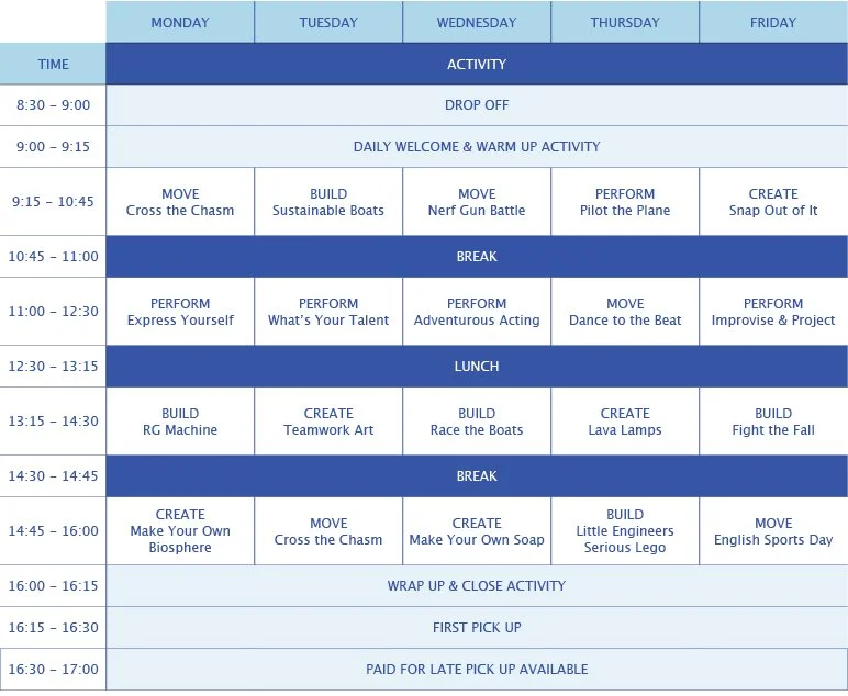 Camp timetable is for illustration purposes. Actual timetable and activities listed may differ from camp to camp.